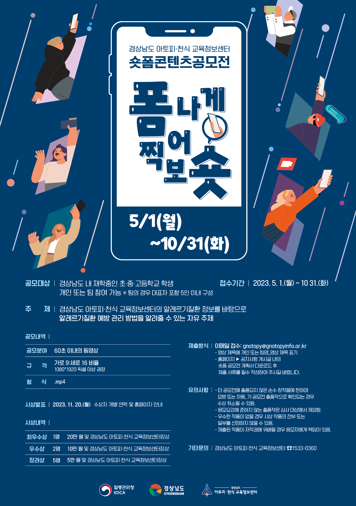 1. 주 제 : 알레르기 질환예방 관리방법을 알려줄 수 있는 자유 주제 2. 대 상 : 경상남도 내 재학중인 초중고 학생 누구나 3. 접수방법 : 센터 메일로 발송(qnatopy@gnatopyinfo.or.kr) 4. 신청기간 : 23. 5. 1.(월) ~ 23. 10. 31.(화) 5. 결과발표 : 23. 11. 20.(월) 홈페이지 공고 및 개별통보 6. 문 의 : 경상남도 아토피·천식 교육정보센터(☎1533-0360, 070-7719-4897~9) |